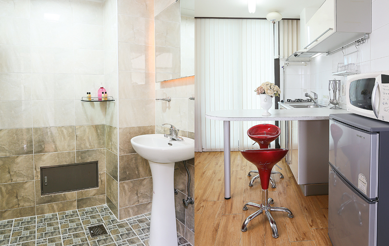 4. 각 객실 마다 전자레인지, 냉장고, 에어컨, 냄비(대,소), 후라이팬(대,소), 믹싱볼셋트, 커피잔, 식기 등 기본적인 주방용품 완비